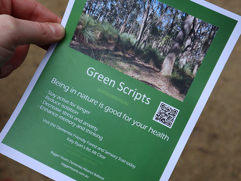 Social prescribing has been shown to reduce health inequities associated with isolation, self-esteem and social connectedness, as well as improve personal well-being. The centrepiece for the practical application of “Green Scripts” is the Dementia Sensory and Forest Trail located in the Woowookarung Regional Park in Ballarat.